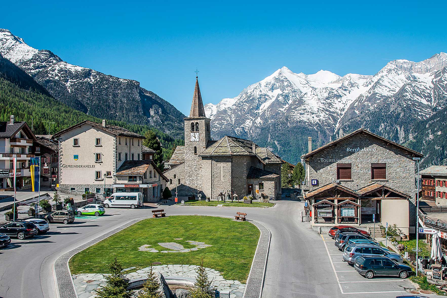 Der grossflächige Dorfplatz wurde 1953 zusammen mit dem letzten Teilstück der Strasse von St. Niklaus nach Grächen erstellt und diente ausschliesslich als Parkplatz, weil man damals das Dorf autofrei halten wollte. Heute ist er ein Treffpunkt für Jung und Alt und ein idealer Ort für Dorffeste und öffentliche Veranstaltungen. Es stehen hier nur noch Kurzzeitparkplätze zur Verfügung, die bei Festanlässen gesperrt sind.